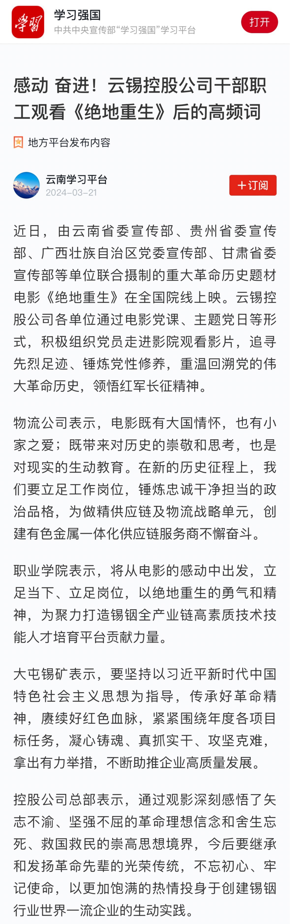 學(xué)習(xí)強國:感動 奮進!云錫控股公司干部職工觀看《絕地重生》后的高頻詞