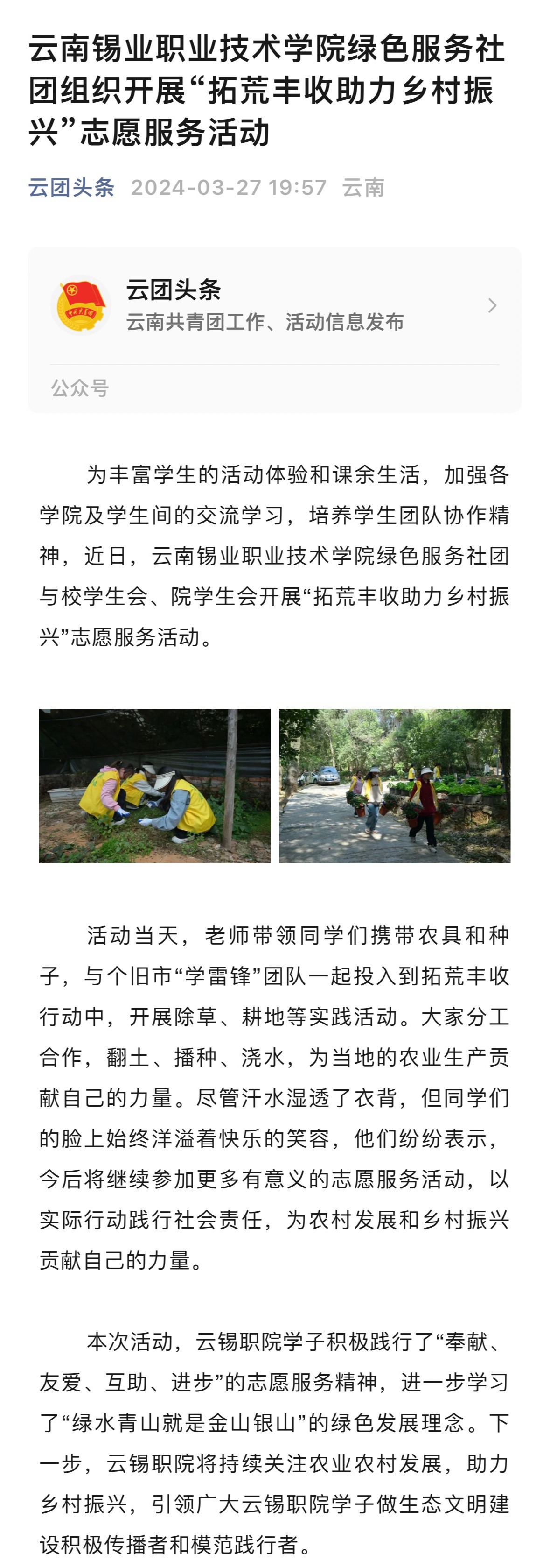 云團頭條:云南錫業職業技術學院綠色服務社團組織開展“拓荒豐收助力鄉村振興”志愿服務活動