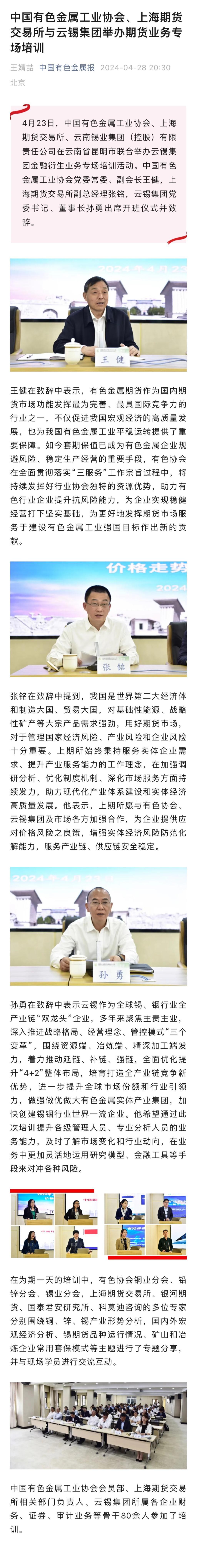 中國有色金屬報:中國有色金屬工業(yè)協(xié)會、上海期貨交易所與云錫集團(tuán)舉辦期貨業(yè)務(wù)專場培訓(xùn)