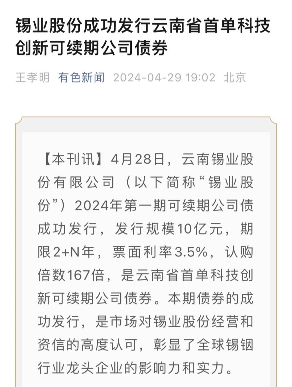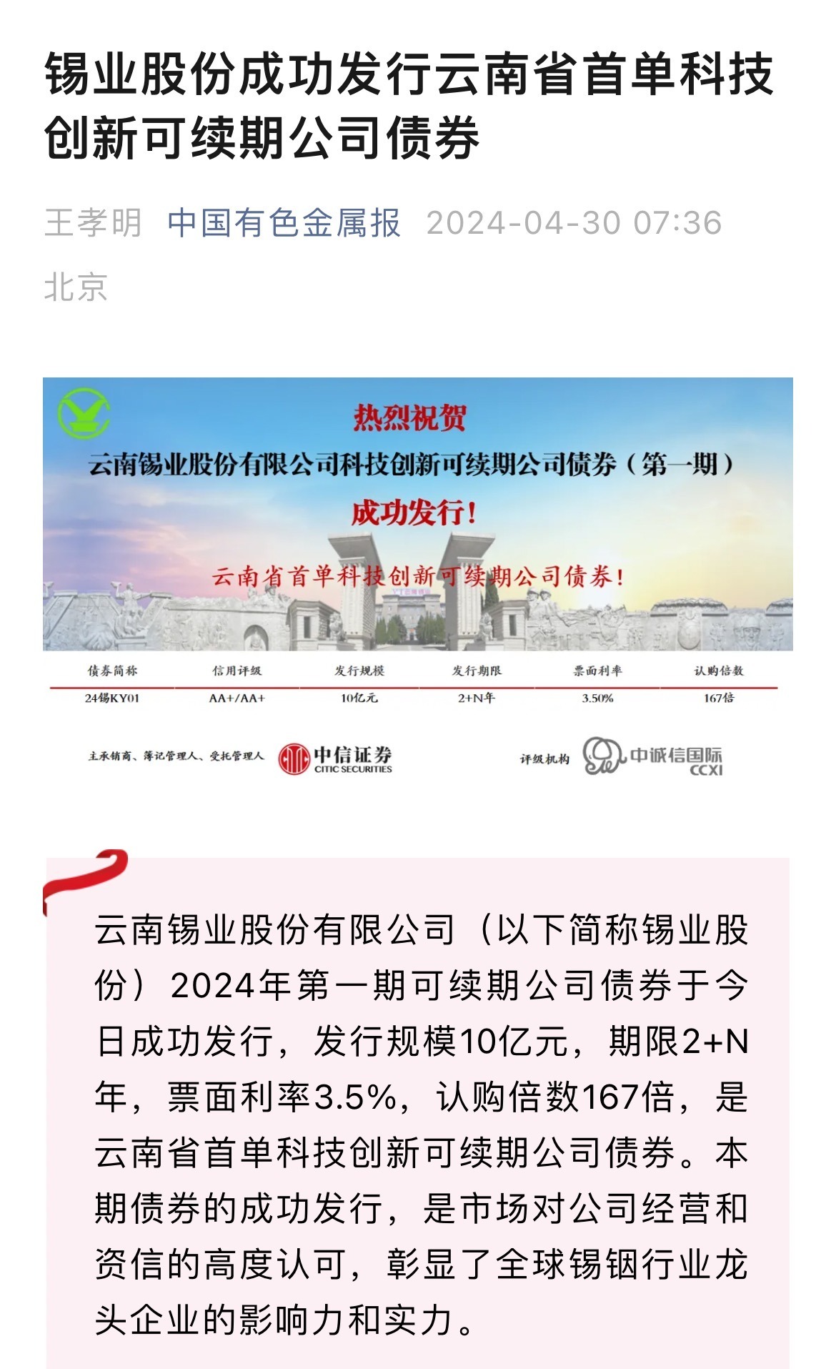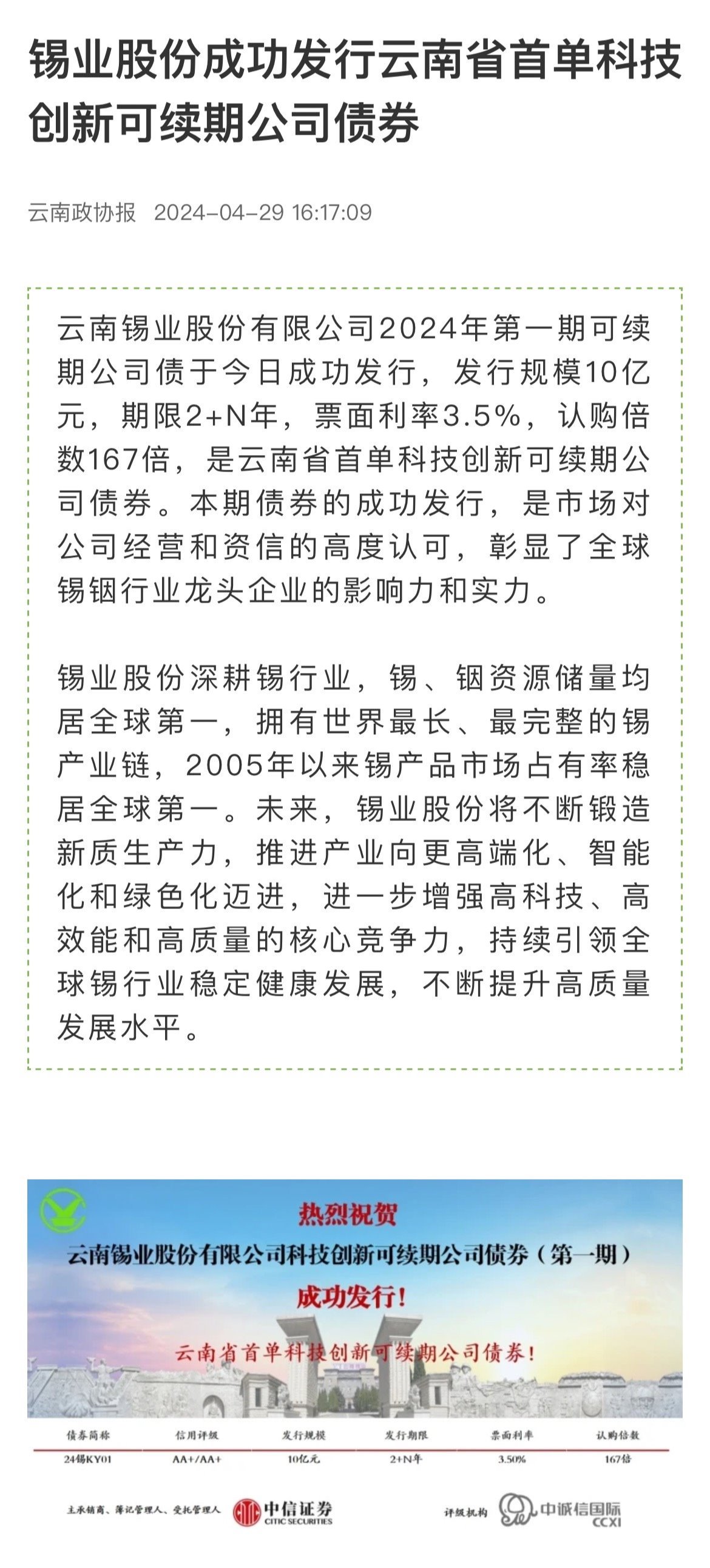 云南政協報、中國有色金屬報、有色新聞:錫業股份成功發行云南省首單科技創新可續期公司債券