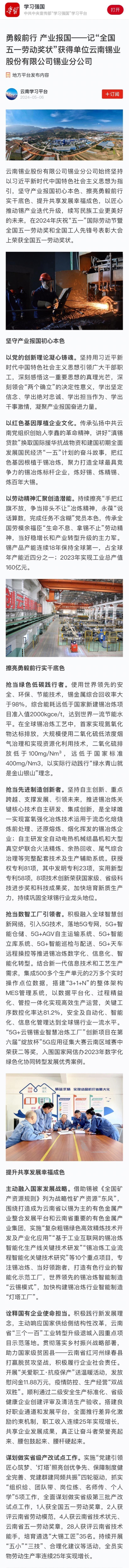 學習強國:勇毅前行 產業報國——記“全國五一勞動獎狀”獲得單位云南錫業股份有限公司錫業分公司
