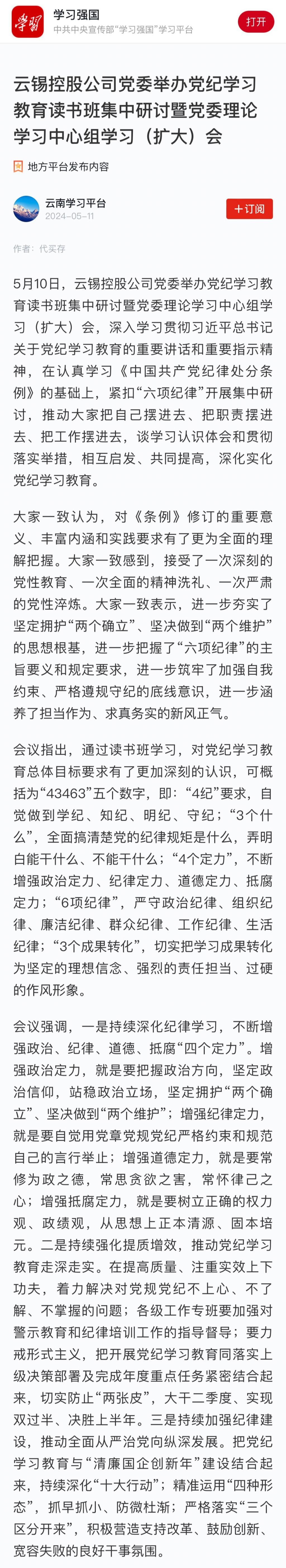 學(xué)習(xí)強(qiáng)國:云錫控股公司黨委舉辦黨紀(jì)學(xué)習(xí)教育讀書班集中研討暨黨委理論學(xué)習(xí)中心組學(xué)習(xí)(擴(kuò)大)會