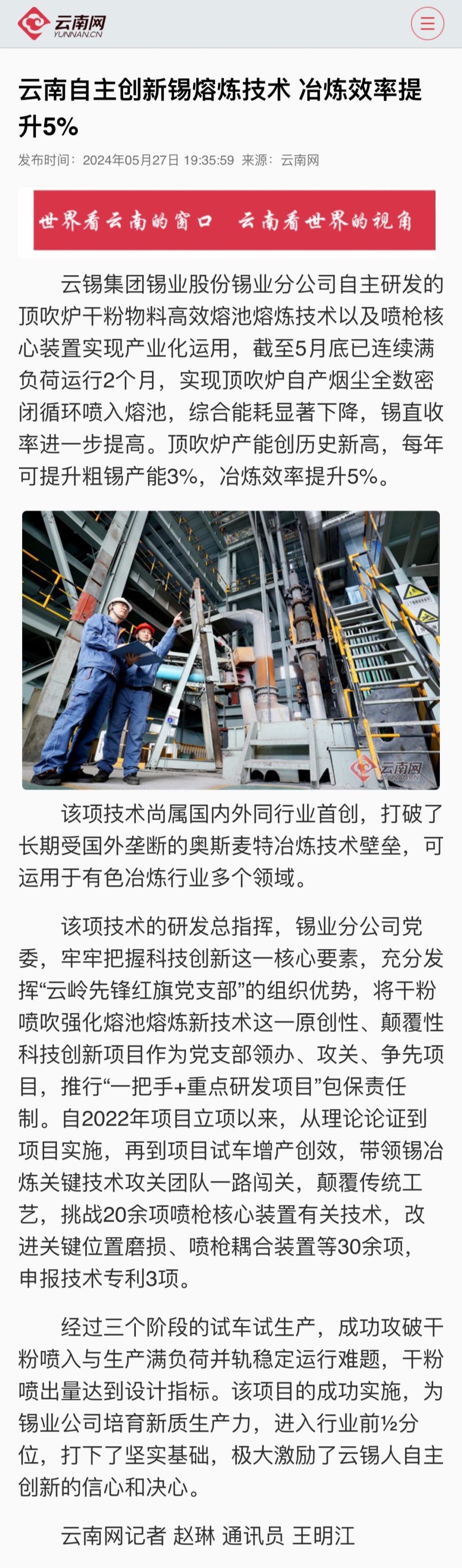 云南網:云錫自主創新錫熔煉技術 冶煉效率提升5%