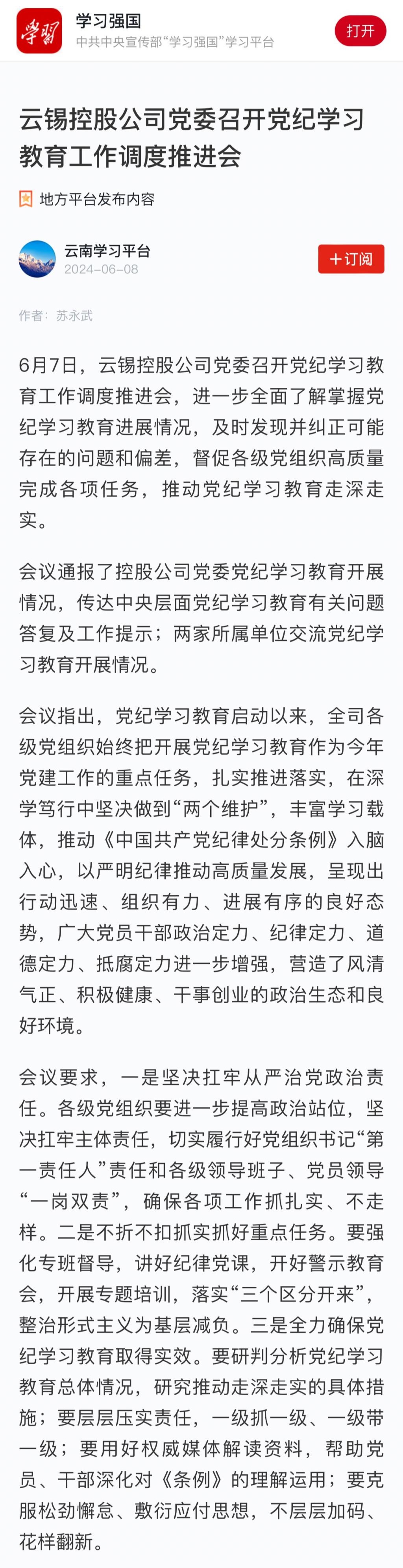 學習強國:云錫控股公司黨委召開黨紀學習教育工作調度推進會
