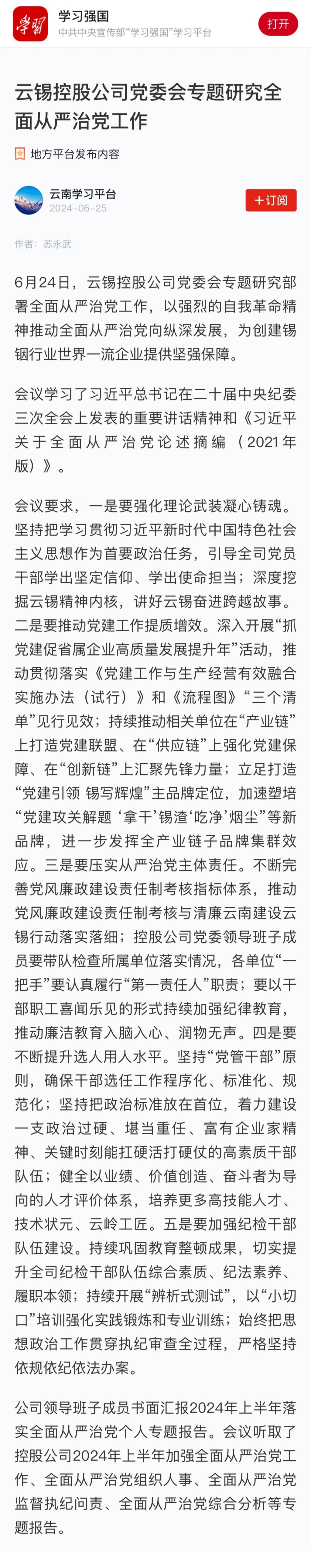 學習強國:云錫控股公司黨委會專題研究全面從嚴治黨工作