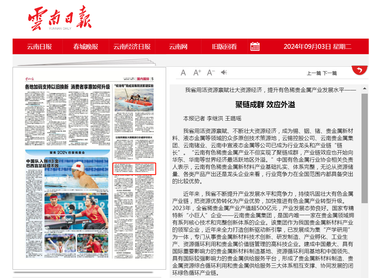 我省用活資源稟賦、不斷壯大資源經濟,成為錫、銦、鍺、貴金屬新材料、液態金屬等領域的眾多原創技術策源地,云錫控股公司、云南貴金屬集團、云南鍺業、云南中宣液態金屬等公司已成為行業龍頭和產業鏈“鏈長”。“云南有色稀貴金屬產業不但實現了聚鏈成群,產業鏈效應也開始向華東、華南等世界經濟最活躍地區外溢。”中國有色金屬行業協會相關負責人表示,云南有色稀貴金屬新材料產業基礎扎實、體系完整,無論從資源儲量、各類產品產出還是龍頭企業來看,行業競爭力在全國范圍內都具備突出的比較優勢。