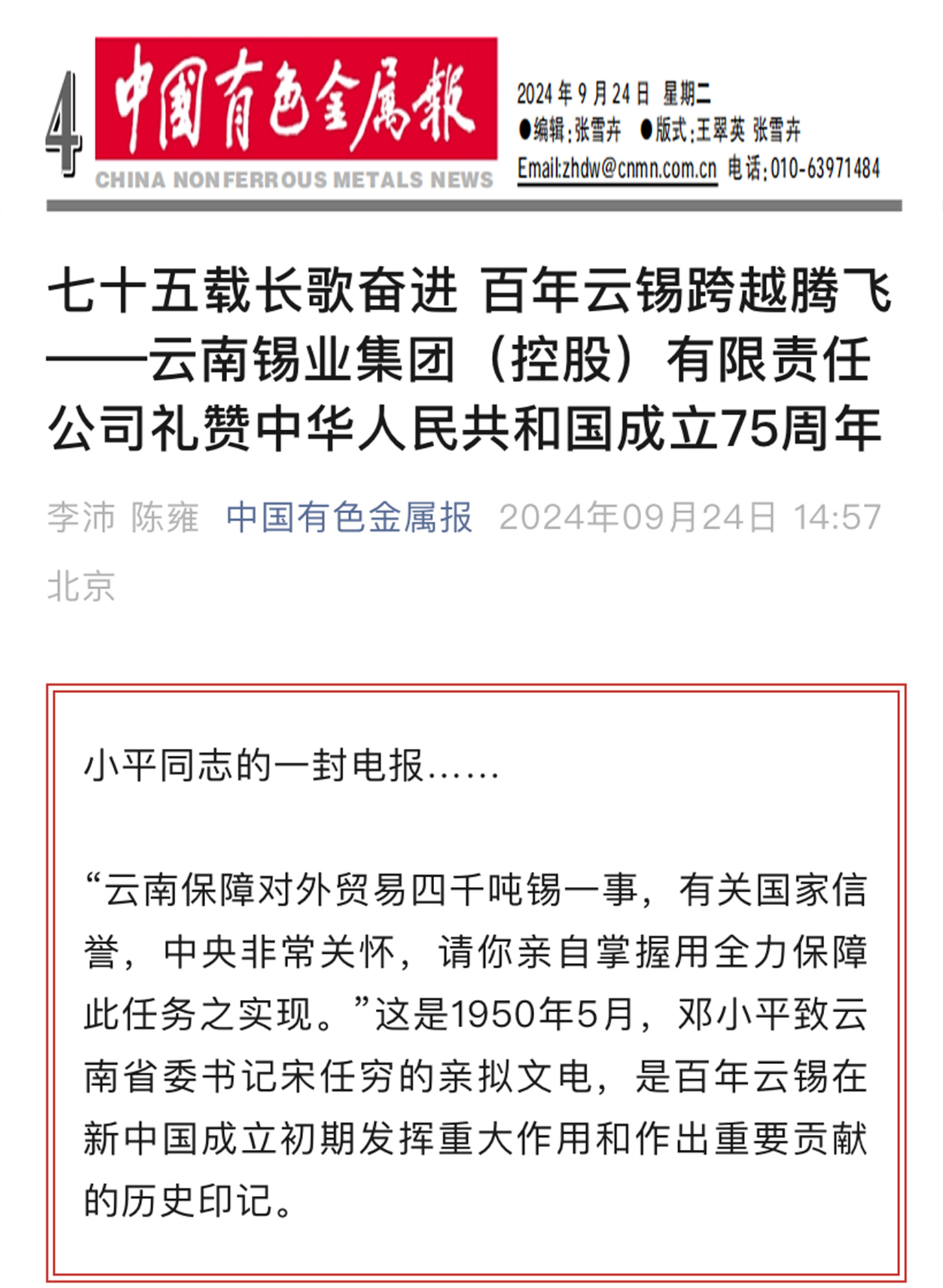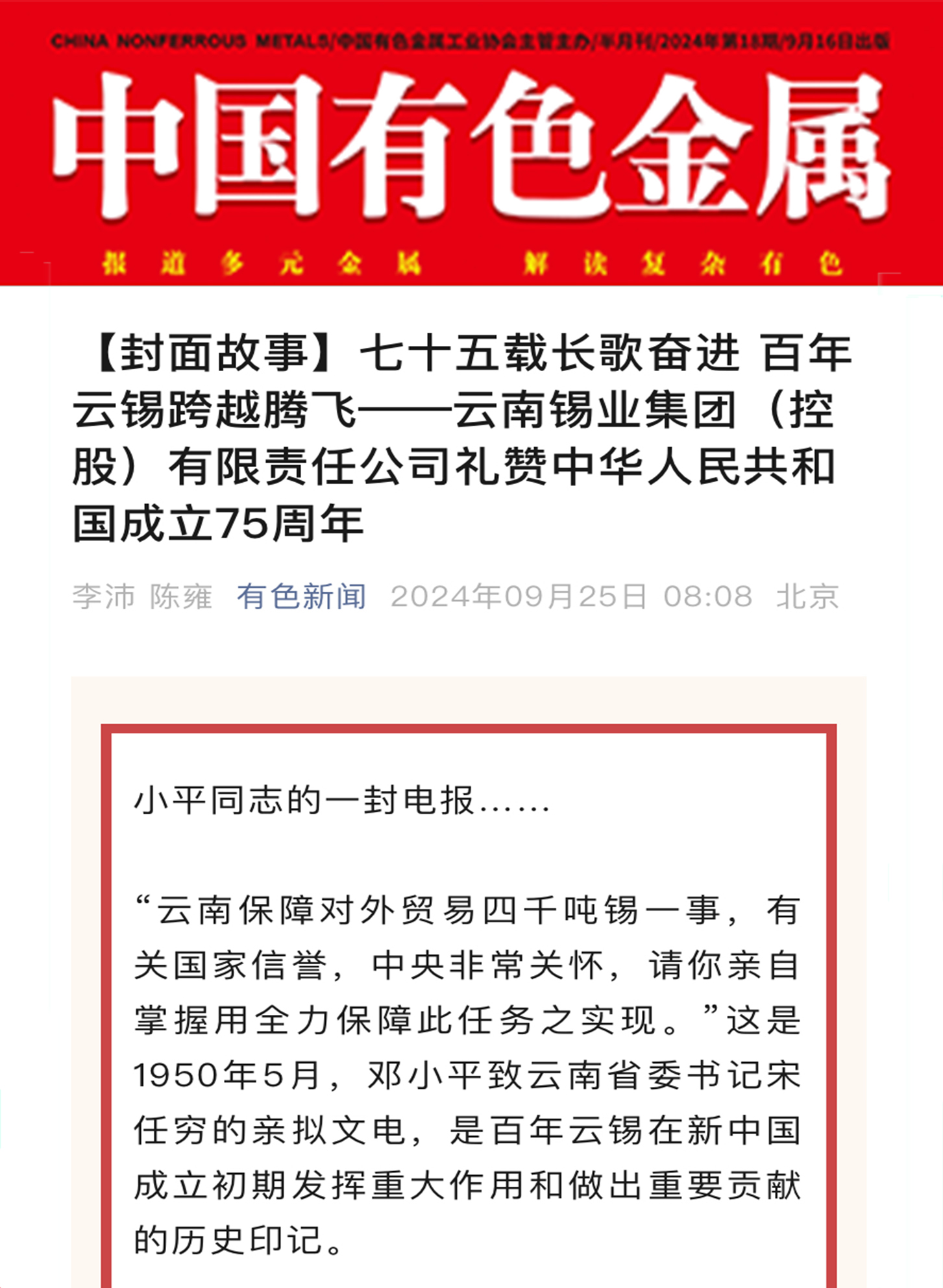 近日,中國有色金屬雜志封面故事、中國有色金屬報專版刊發《七十五載長歌奮進 百年云錫跨越騰飛——云南錫業集團(控股)有限責任公司禮贊中華人民共和國成立75周年》,全面展現百年云錫跨越騰飛的壯美畫卷。