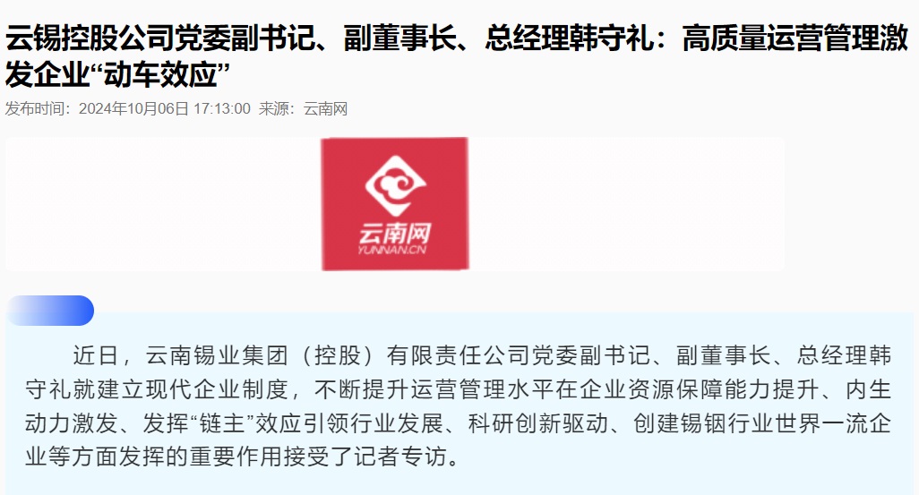 近日,云南錫業集團(控股)有限責任公司黨委副書記、副董事長、總經理韓守禮就建立現代企業制度,不斷提升運營管理水平在企業資源保障能力提升、內生動力激發、發揮“鏈主”效應引領行業發展、科研創新驅動、創建錫銦行業世界一流企業等方面發揮的重要作用接受了記者專訪。