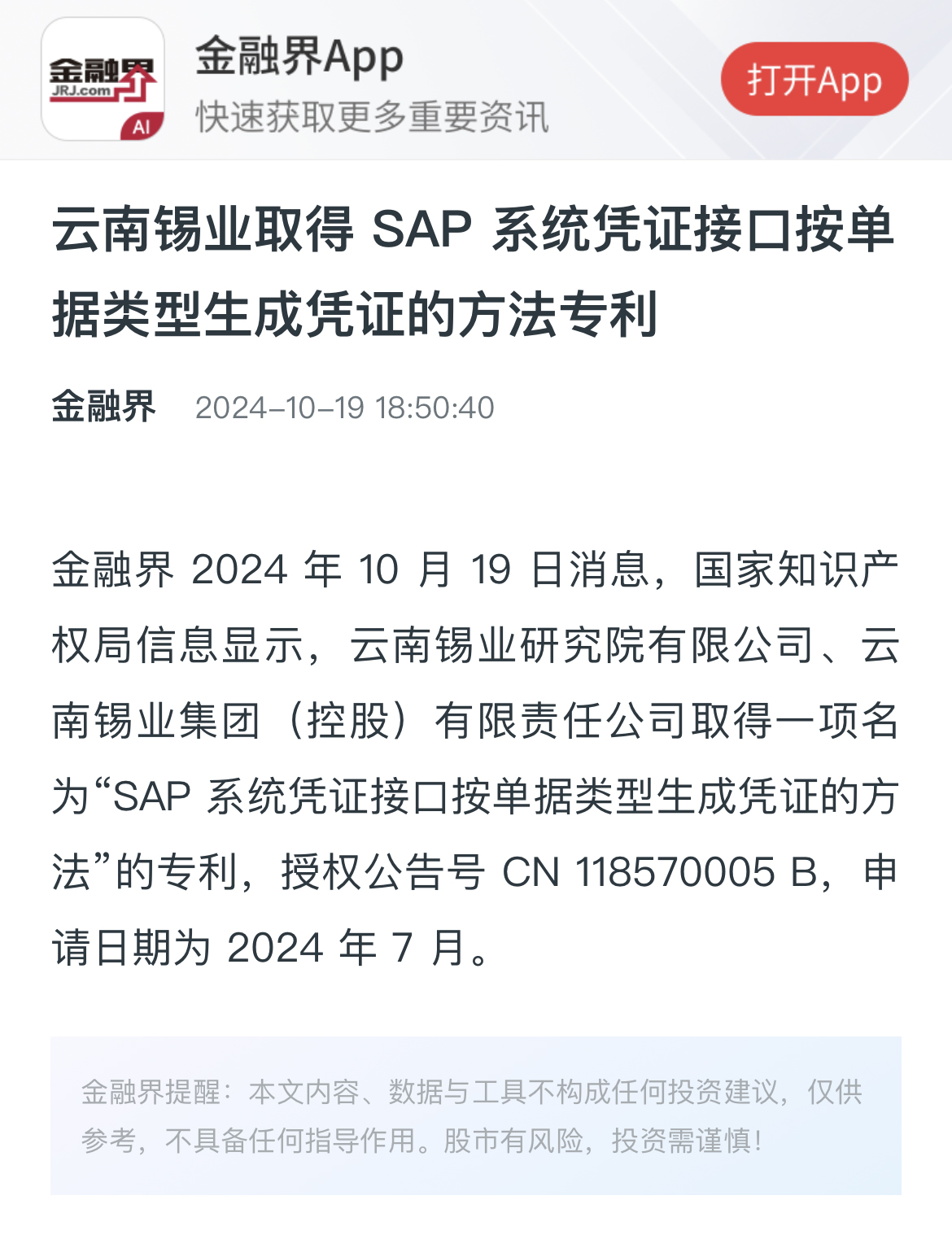 金融界:云南錫業取得SAP系統憑證接口按單據類型生成憑證的方法專利