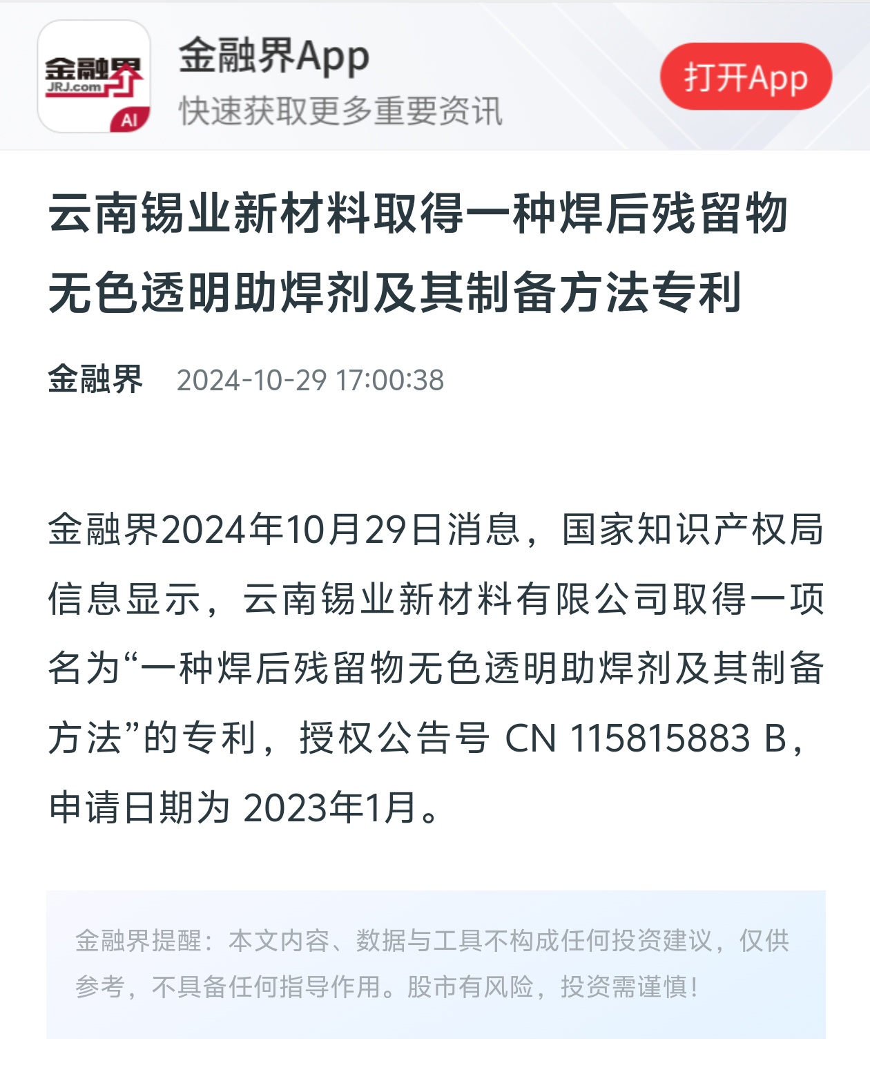 金融界:云南錫業新材料取得一種焊后殘留物無色透明助焊劑及其制備方法專利