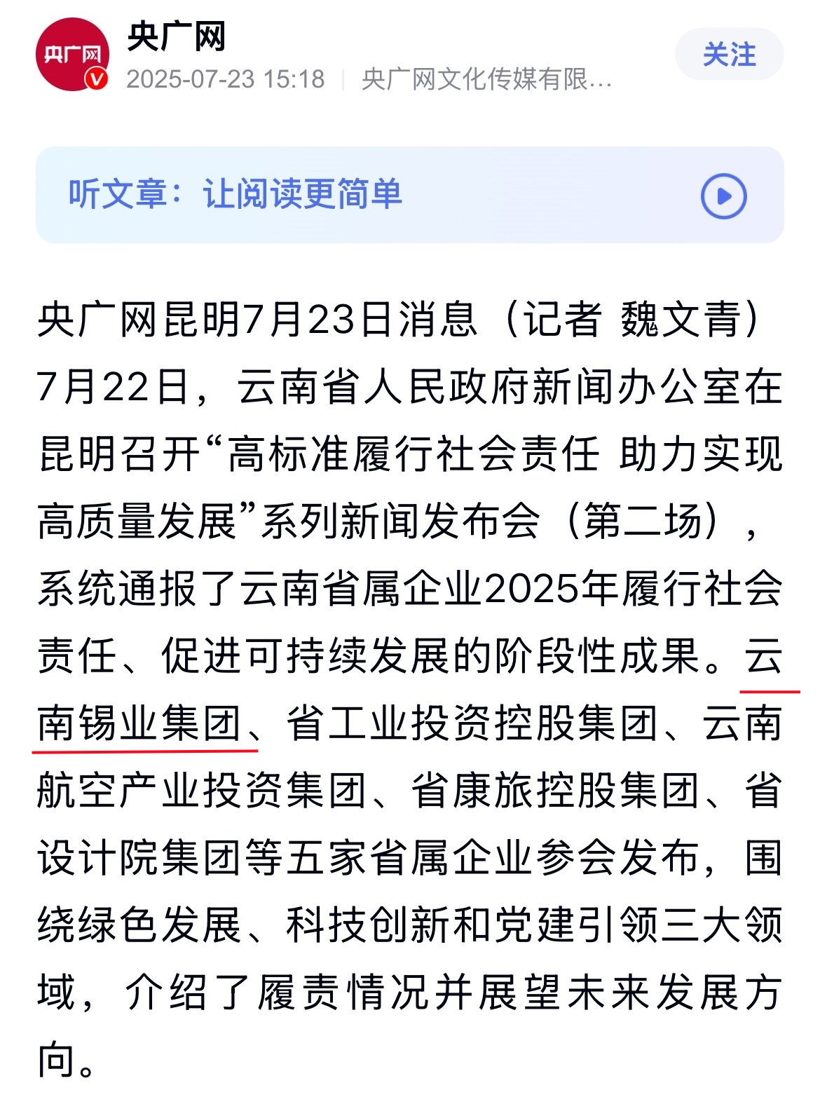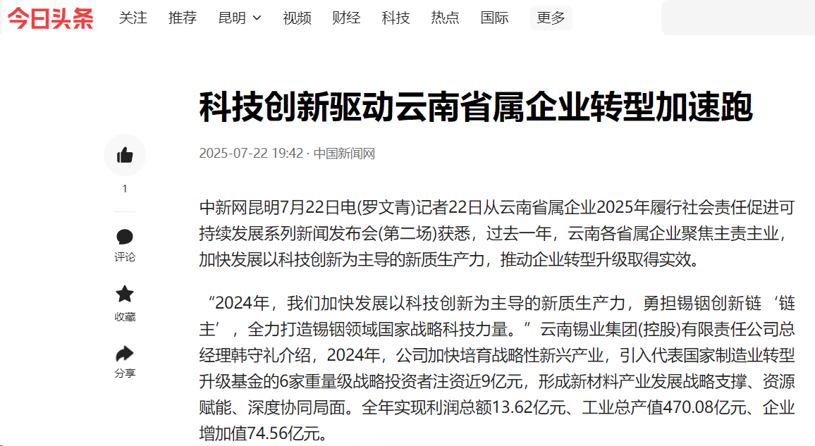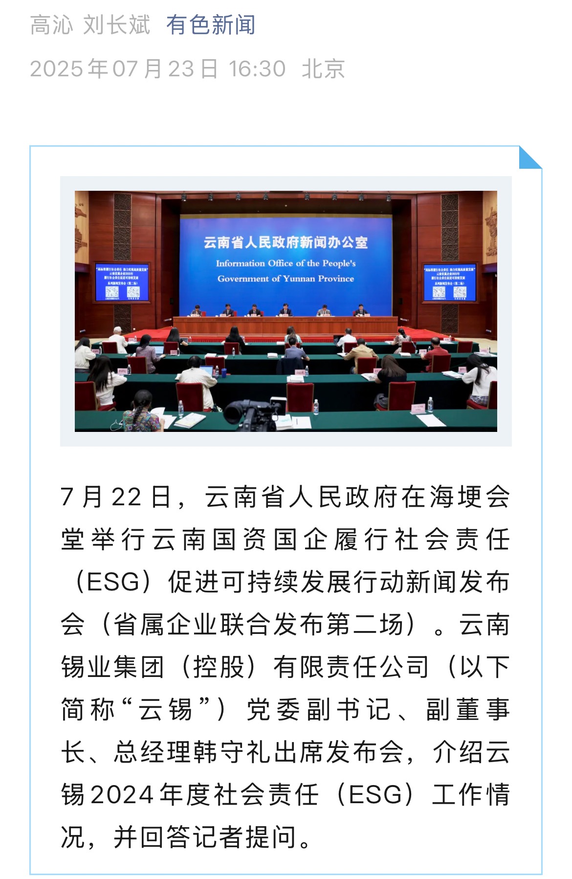鏈接:(央廣網(wǎng))、(央視影音)、(新華網(wǎng))、(新華時(shí)訊)、(中國(guó)日?qǐng)?bào)網(wǎng))、(中國(guó)新聞網(wǎng))、(中國(guó)網(wǎng))(云南新聞聯(lián)播)、(云南衛(wèi)視晚間新聞)、(云南發(fā)布)、(云南日?qǐng)?bào))、(云南日?qǐng)?bào)-云新聞)、(云南網(wǎng))、(七彩云端)、(云南省人民政府)、(云嶺先鋒網(wǎng))、(云南國(guó)資)、(云南政協(xié)報(bào))、(有色金屬報(bào))、(有色新聞)、(騰訊新聞)、(今日頭條)、(搜狐)、(網(wǎng)易)、(新浪微博)、(新浪財(cái)經(jīng))、(都市時(shí)報(bào))、(國(guó)泰君安)、(昆明日?qǐng)?bào))、(春城晚報(bào))、(昆明信息港)、(開屏新聞