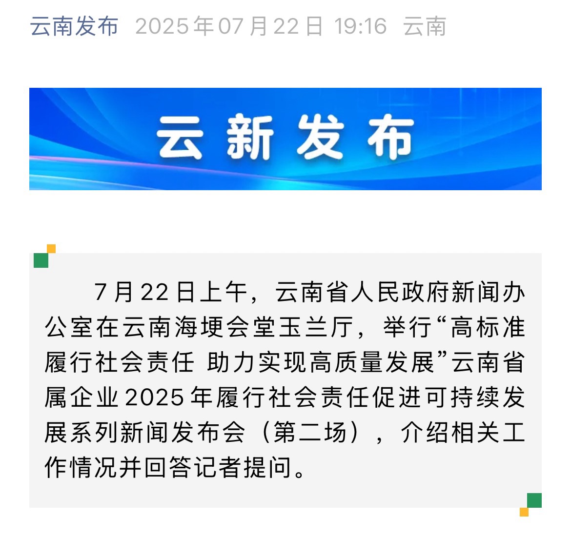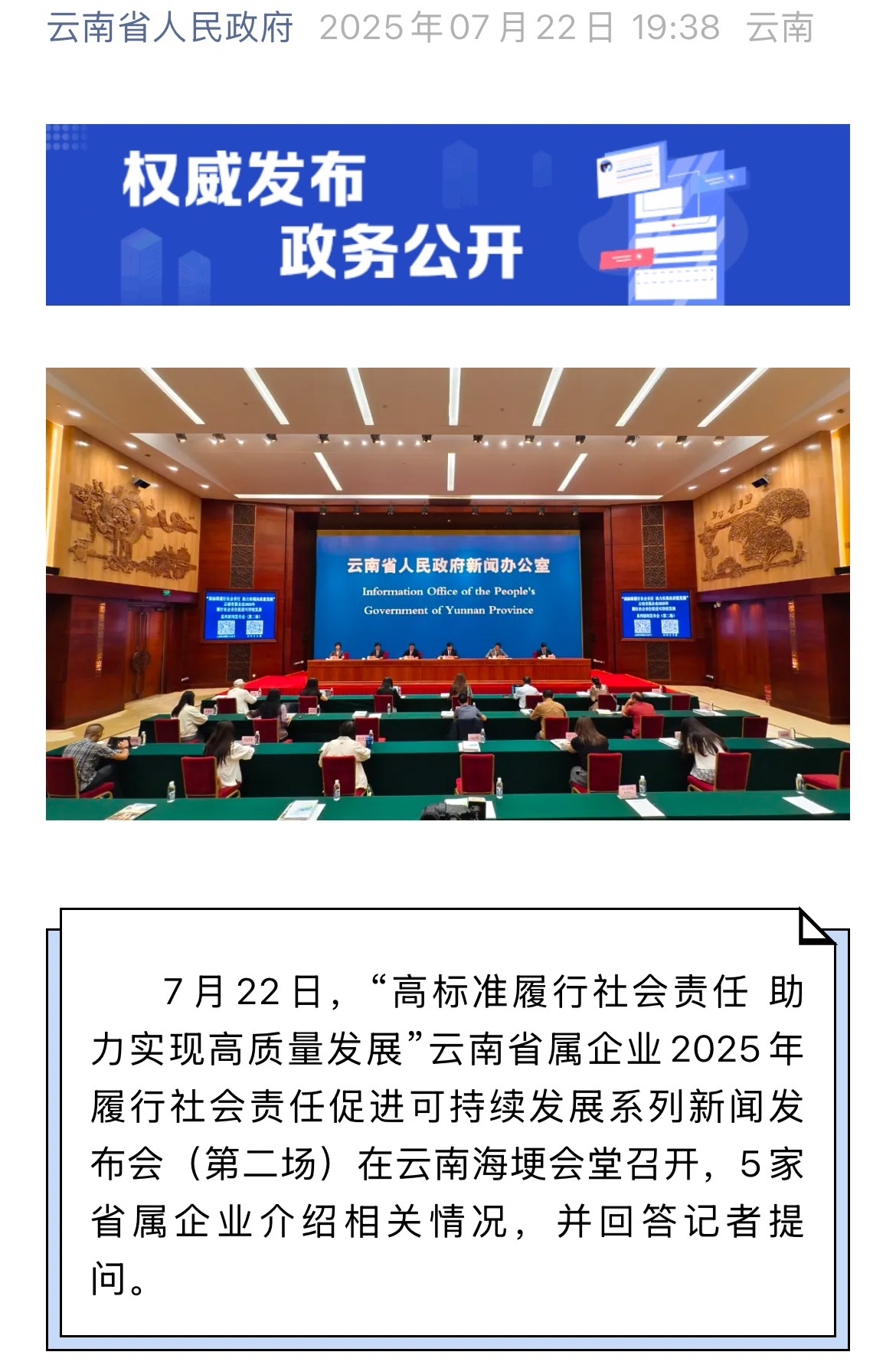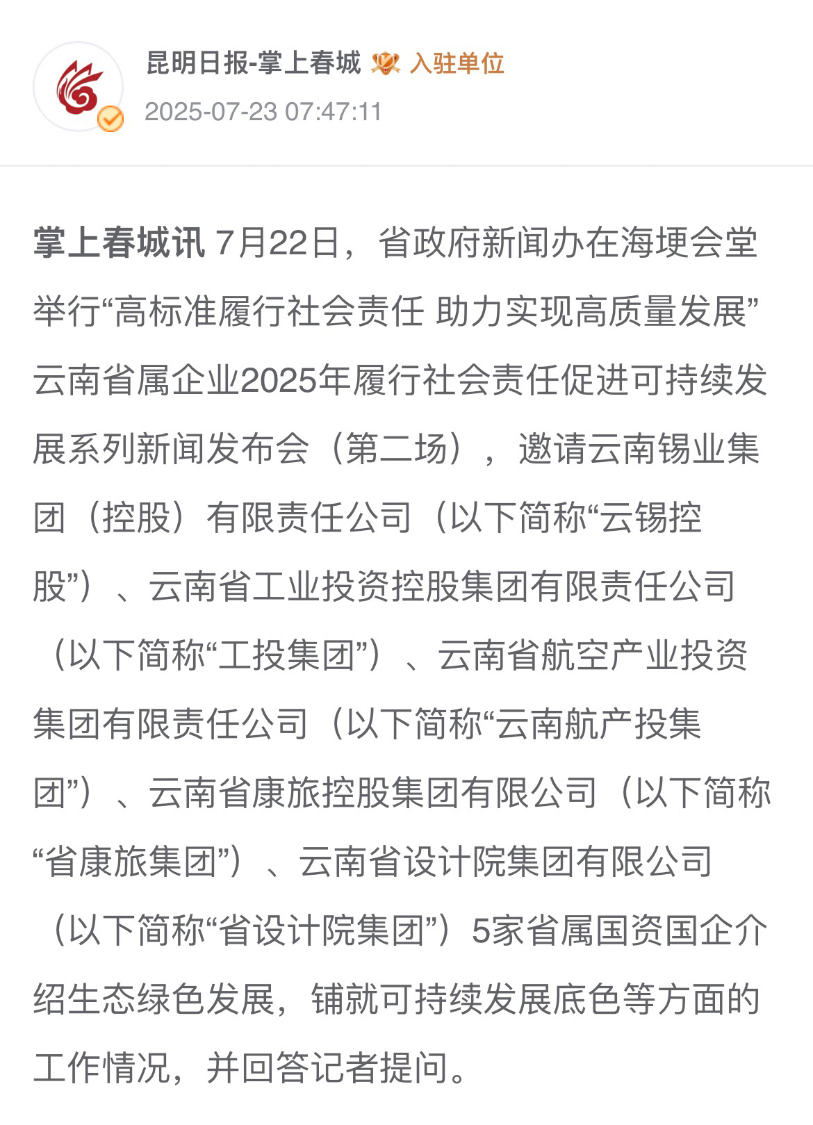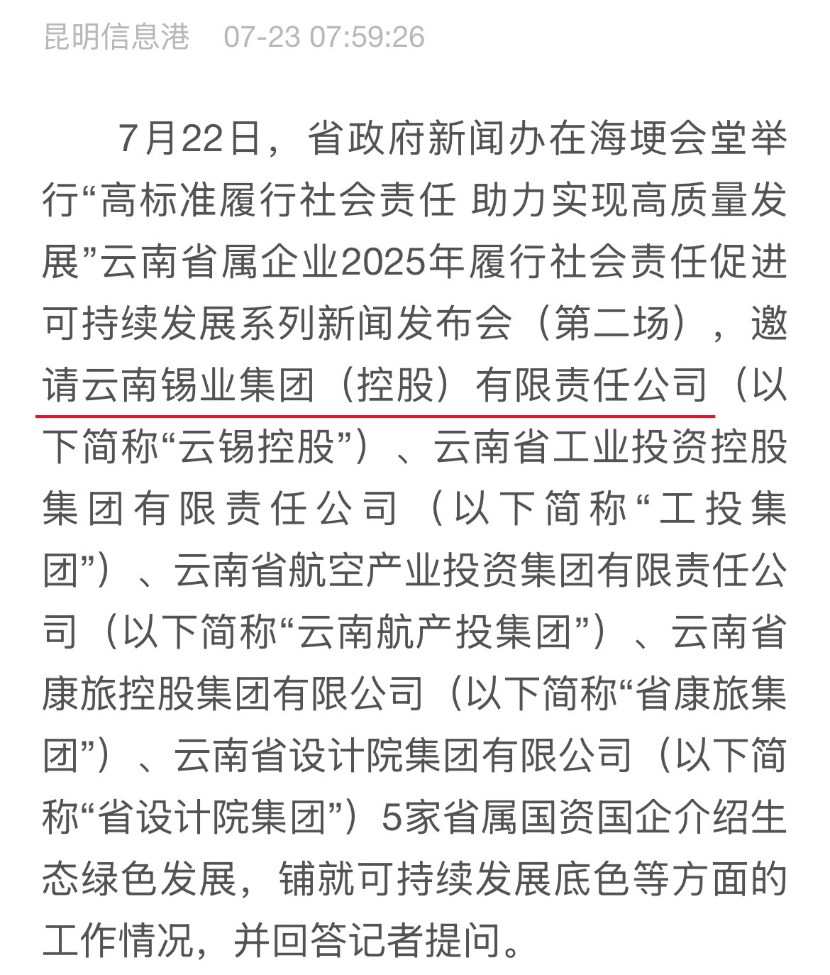 來(lái)源:央廣網(wǎng)、央視影音、新華網(wǎng)、新華時(shí)訊、中國(guó)日?qǐng)?bào)網(wǎng)、中國(guó)新聞網(wǎng)、中國(guó)網(wǎng)云南新聞聯(lián)播、云南衛(wèi)視晚間新聞、云南發(fā)布、云南日?qǐng)?bào)、云南日?qǐng)?bào)-云新聞、云南網(wǎng)、七彩云端、云南省人民政府、云嶺先鋒網(wǎng)、云南國(guó)資、云南政協(xié)報(bào)、有色金屬報(bào)、有色新聞、騰訊新聞、今日頭條、搜狐、網(wǎng)易、新浪微博、新浪財(cái)經(jīng)、都市時(shí)報(bào)、國(guó)泰君安、昆明日?qǐng)?bào)、春城晚報(bào)、昆明信息港、開屏新聞
