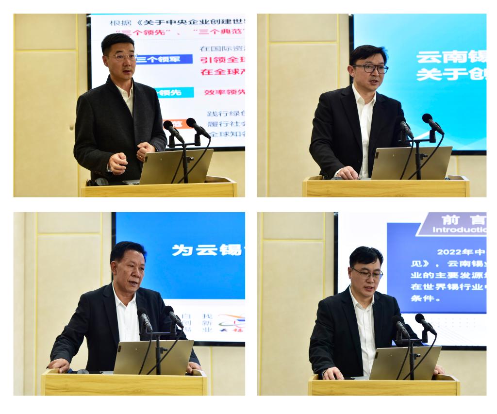 控股公司戰(zhàn)略管理部匯報前期工作進(jìn)展、基礎(chǔ)條件和相關(guān)政策解讀;控股公司財務(wù)管理部、投資管理部、組織人事部、創(chuàng)新&數(shù)字化中心、錫業(yè)股份、研究院公司(研發(fā)中心)、物流公司圍繞如何創(chuàng)建世界一流企業(yè)分別發(fā)言。