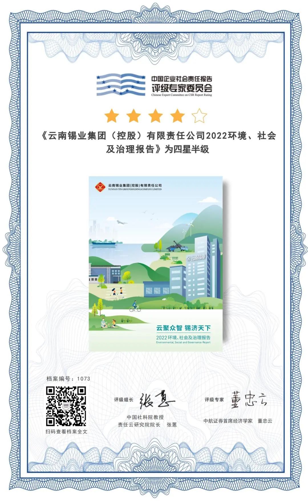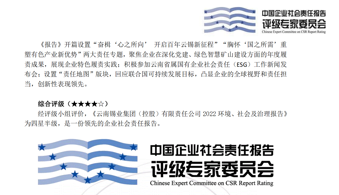 近日,中國企業社會責任報告評級專家委員會發布評級結果,《云南錫業集團(控股) 有限責任公司2022環境、社會及治理報告》首次參評即獲“四星半級”,被綜合評定為“是一份領先的企業社會責任報告”。目前,云南省屬企業僅有2家獲得“四星半級”認定,凸顯了云錫在公司治理、責任管理等方面的領先優勢。