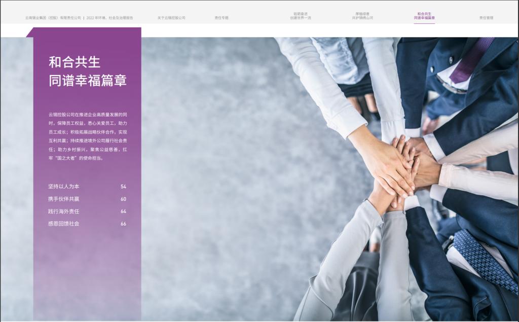 報告通過“砥礪奮進 創建世界一流”“厚植綠意 共護錦繡山河”“和合共生 同譜幸福篇章”三大部分系統總結云錫在規范企業治理、踐行安全綠色發展、強化創新驅動和共建共享,實現企業和社會、環境全面協調可持續發展的經驗做法,系統展現公司對國家、環境、客戶、伙伴、員工、社會等的履責理念、實踐與成效,充分回應了利益相關方的責任期望與訴求,彰顯了“錫業驕子”“行業龍頭”矢志“恪守產業報國”“勇擔國之大者”的鮮明特點。