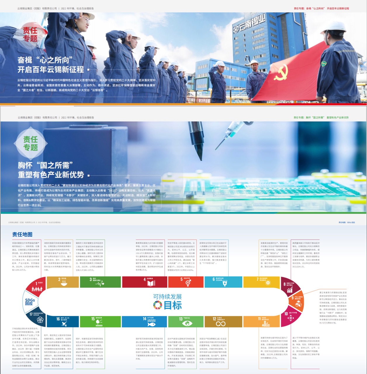 報告以“云聚眾智 錫濟天下”的企業精神和責任理念為統領,通過“奮楫‘心之所向’ 開啟百年云錫新征程”“胸懷‘國之所需’重塑有色產業新優勢”兩大責任專題,高度凝練展示云錫在深化黨建引領、綠色創新發展、踐行產業報國等方面的特色履責實踐。通過設置“責任地圖”版塊,回應聯合國可持續發展目標,凸顯企業的全球視野和責任擔當。