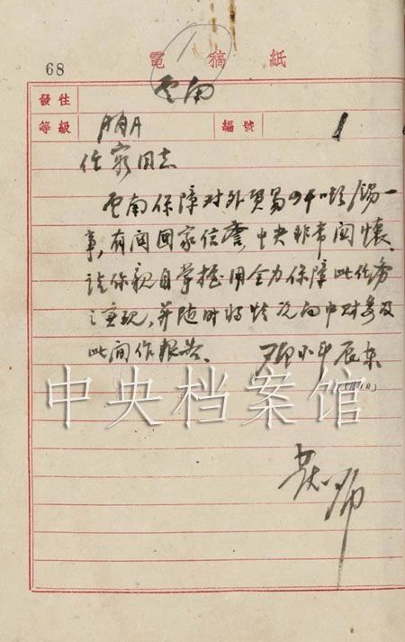 鄧小平親擬文電致云南省委書記、省軍政委員會副主席宋任窮。(圖源:中央檔案館)
