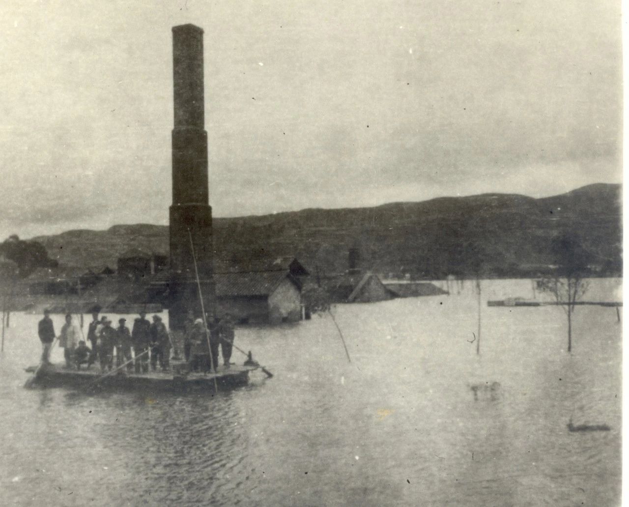 洪水淹沒個舊煉廠后,煉錫工人打撈設備。
