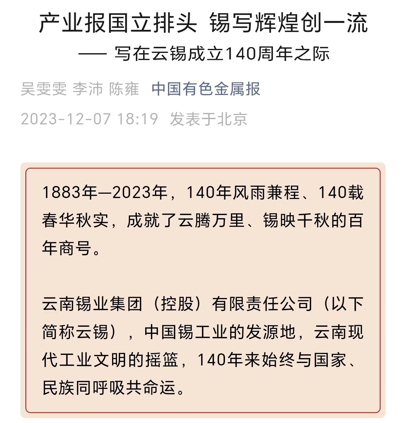 近日,中國有色金屬報頭條刊發《產業報國立排頭 錫寫輝煌創一流——寫在云錫成立140周年之際》,全面展現百年云錫波瀾壯闊的歷史跨越。