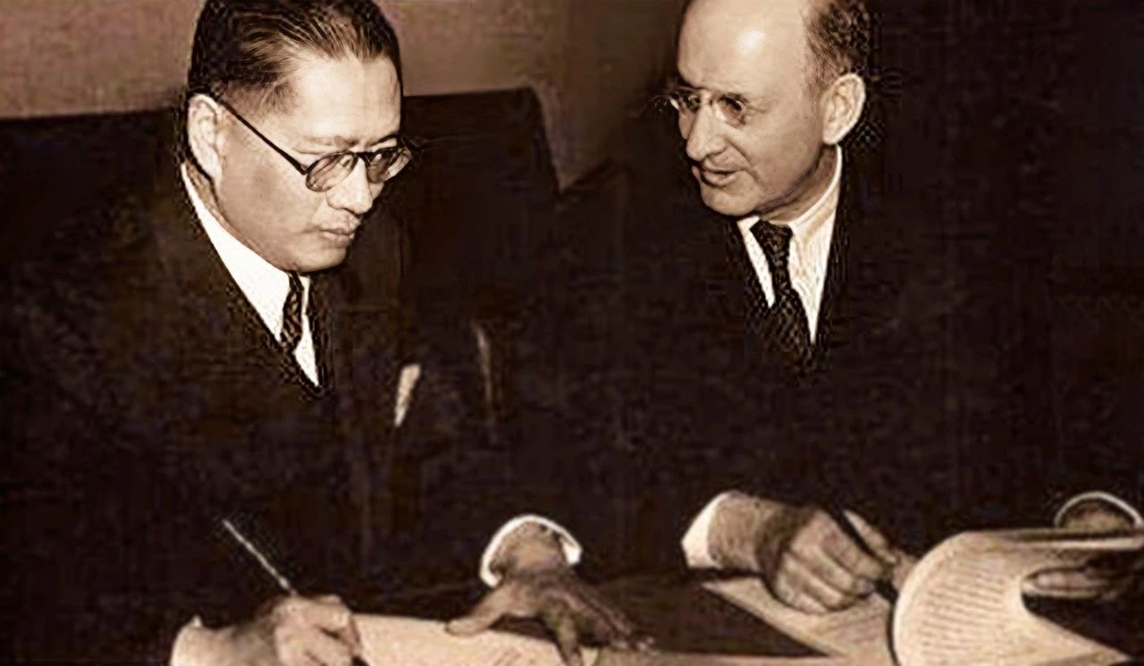 圖左為代表國民政府赴美接洽滇錫貸款事項的著名民間銀行家有著“中國摩根”之稱的陳光甫(1881年—1976年)簽署協議。