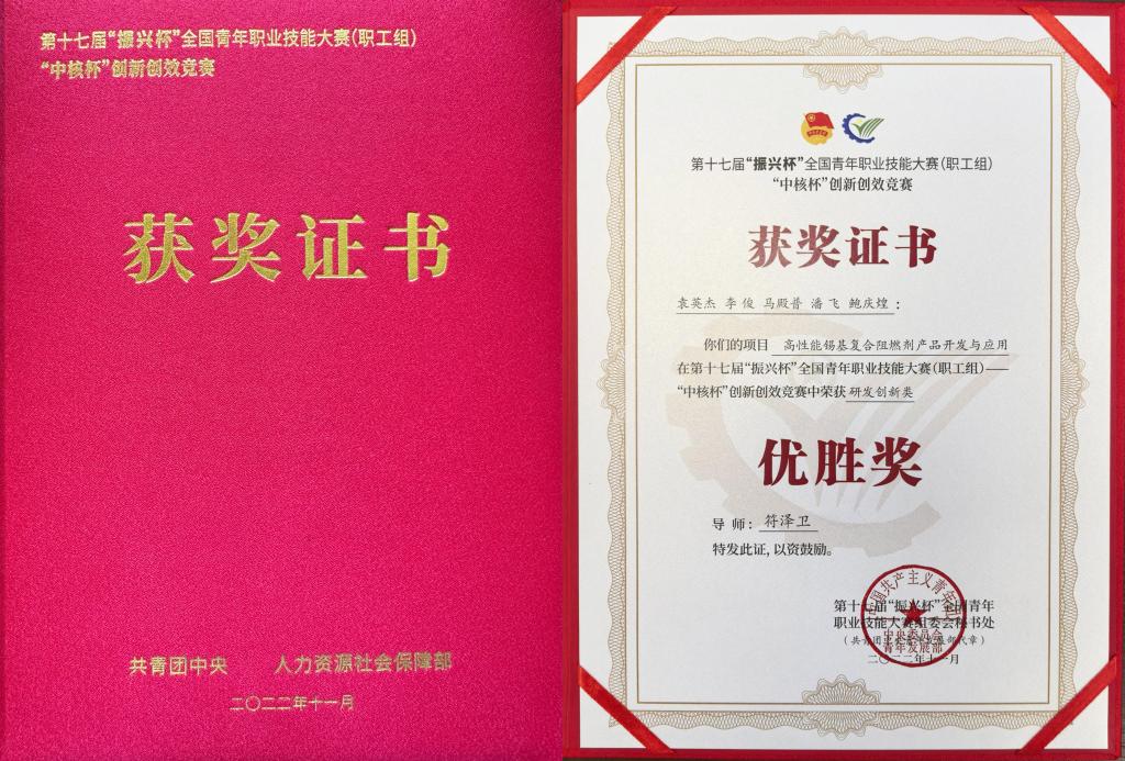 在第十七屆“振興杯”全國青年職業技能大賽(職工組)——創新創效競賽中,云錫阻燃劑團隊憑借“高性能錫基復合阻燃劑產品開發與應用”項目課題榮獲優勝獎。該賽事由共青團中央、人力資源和社會保障部聯合主辦,是國家一類技能大賽,首次面向青年職工增設創新創效競賽,影響深遠、含金量高。大賽旨在激發廣大青年特別是企業青年創造潛能、創新活力和創優精神,提升青年職業技能水平與創新創效能力,倡導技能成才、技能報國之志,弘揚勞模精神、勞動精神和工匠精神。