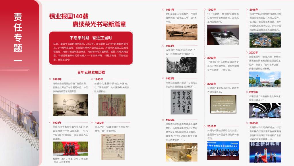 《報告》開篇設“錫業報國140載 賡續榮光書寫新篇章”“戰略謀局繪藍圖 奮進跨越啟航新征程”兩大責任專題,緊扣2023年是云錫始創140周年和實施“3815”戰略“三年強攻關”開篇之年兩條時間軸線,通過對百年云錫歷史回望和未來展望,結合黨的建設、全面從嚴治黨年度重點成效,在內容上拓展深度和廣度,讓報告更具時代性和獨特性。
