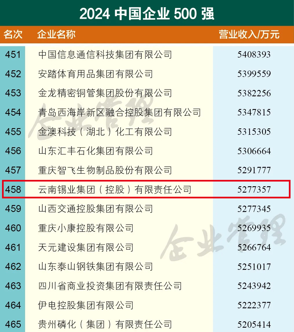日前,中國企業(yè)聯(lián)合會、中國企業(yè)家協(xié)會聯(lián)合發(fā)布2024中國企業(yè)500強、中國制造業(yè)企業(yè)500強榜單。云錫位列2024中國企業(yè)500強第458位、中國制造業(yè)企業(yè)500強第240位。