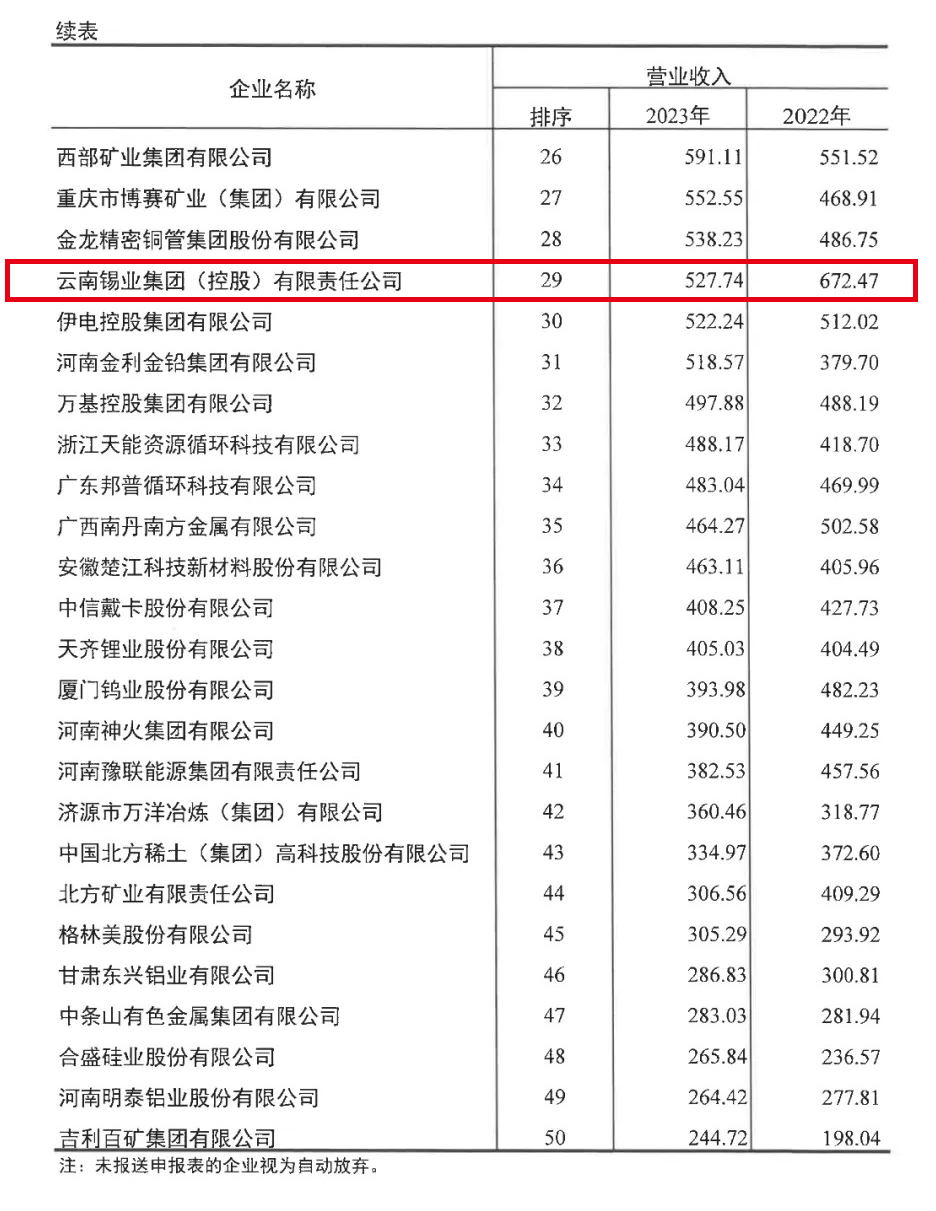 在中國有色金屬工業(yè)協(xié)會發(fā)布的2023年有色金屬企業(yè)50強榜單中,云錫位列第29位。