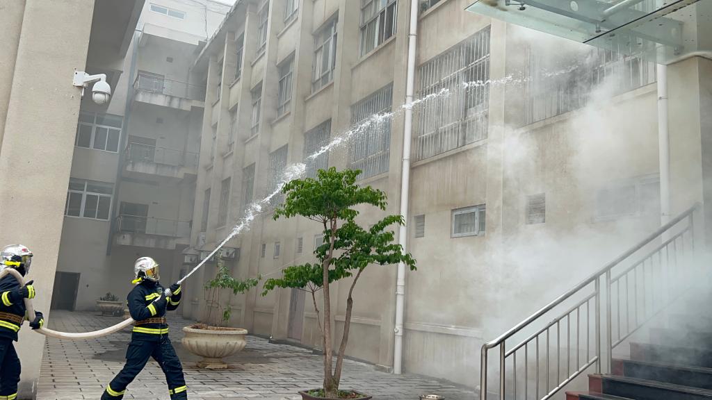 隨著演練模擬的火災(zāi)煙霧開始蔓延,演練人員方案的要求按滅火行動(dòng)組、通訊聯(lián)絡(luò)組、疏散引導(dǎo)組、安全救護(hù)組、安全警戒組、宣傳運(yùn)輸保障組分工協(xié)作,保證了科技樓疏散人員用毛巾掩住口鼻,沿預(yù)定路線有序撤離,火災(zāi)得以及時(shí)撲滅。