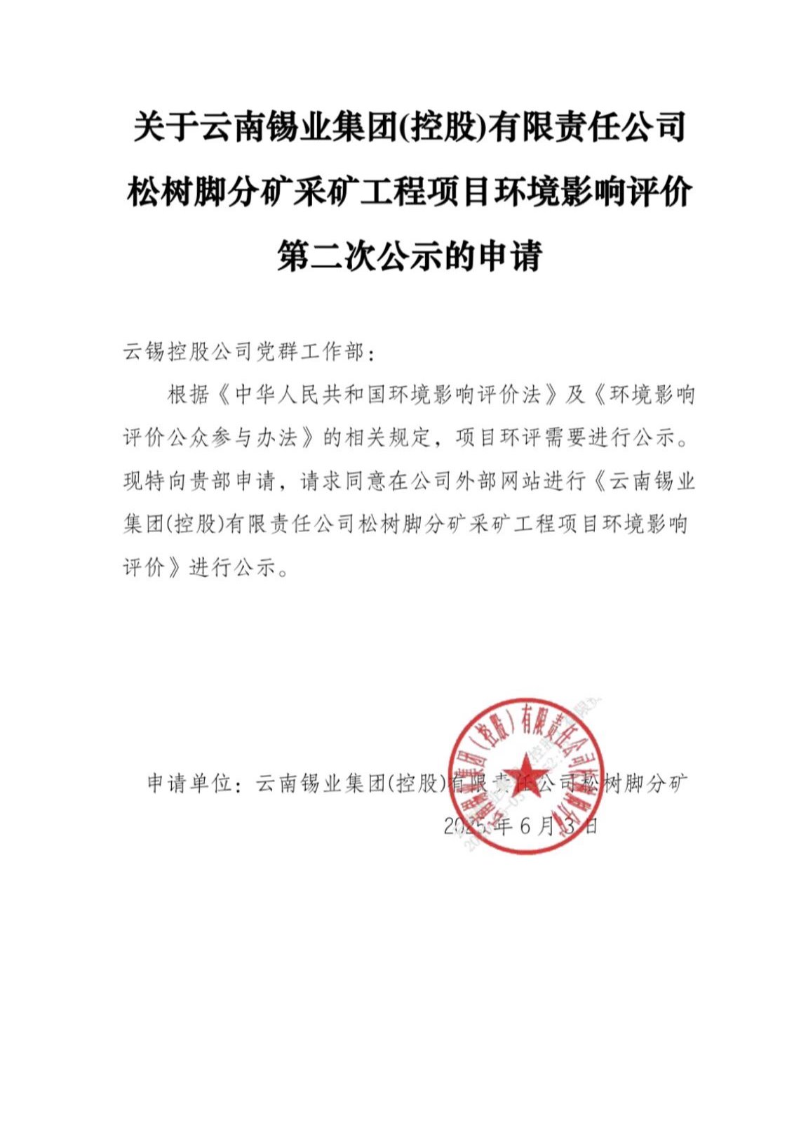 關于云南錫業集團(控股)有限責任公司松樹腳分礦采礦工程項目環境影響評價第二次公示的申請