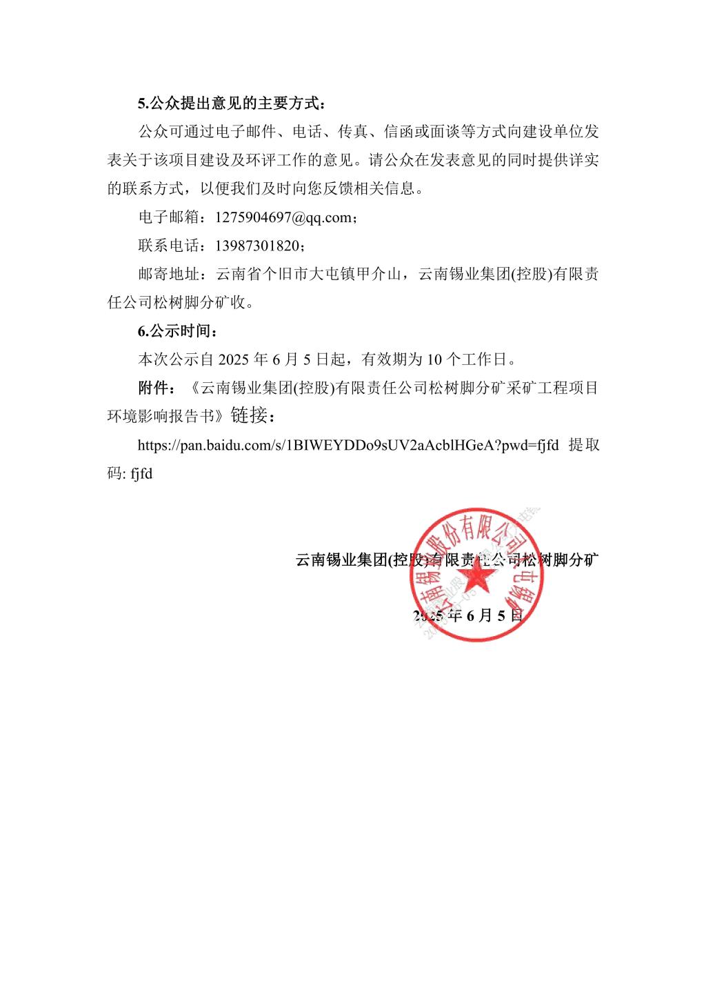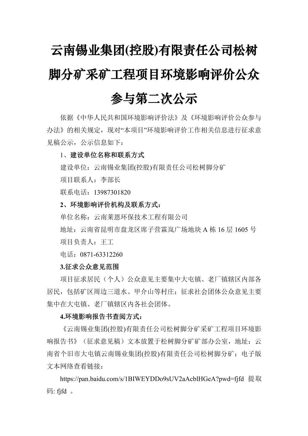 云南錫業集團(控股)有限責任公司松樹腳分礦采礦工程項目環境影響評價公眾參與第二次公示